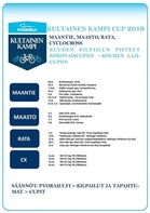 Kultainen Kampi Cup kannustaa nuoria pyöräilijöitä kokeilemaan kilpailuja monipuolisesti eri lajeissa, joissa muutoinkin luonnollinen yhdistyminen ikäluokkien ja osin kaluston myötä on mahdollista. Vuonna 2019 Kultainen Kampi Cupissa ovat mukana lajeina maantie-, maasto- ja ratapyöräily; sekä uutena lajina mukaan tulee Hel CX Cupin sisältä 4 cyclocrosskilpailua. Näin cupin kilpailut jakautuvat laajalle aikavälille keväästä syksyyn. Muut kilpailut ovat jo nimetty, mutta cyclocrosskisat (4 kilpailua) julkistetaan HETI Hel CX Cupin julkistamisen jälkeen. KK Cup sisältää kokonaisuudessaan 20 kilpailua neljässä lajissa, joista kuuteen (6) kilpailuun vähintään kahdessa lajissa (enintään 3 eniten pisteitä tuottanutta kilpailua per laji), tulee osallistua ollakseen kokonaiskilpailun pistelaskussa. o 8 maantiekilpailua o 4 maastokilpailua, joista kaikki XCO-cupissa o 4 ratakilpailua o 4 cyclocross kilpailua, joista kaikki HEL CX-cupissa => maantie sis. 8 kilpailua huomioiden myös pohjoinen Suomi, mutta vain kolmesta eniten pisteitä tuottaneesta kisasta per laji lasketaan pisteet niin kokonaiscupiin kuin lajicupiin